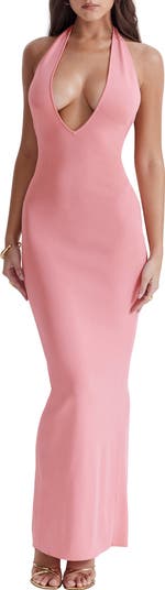 A deeply plunging halter neck lends daring drama to this ribbed maxi dress designed with an easy-moving back vent.