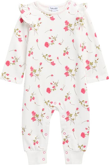 Bring out baby s retro vibe in this long-sleeve jumpsuit detailed with an adorable ruffle trim and dainty floral pattern.