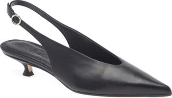 A pointy toe elongates the silhouette of this smooth-leather pump secured with an adjustable slingback and set on a walkable kitten heel.
