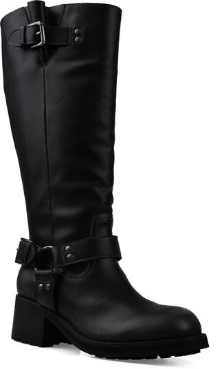 Buckle and harness hardware bring just the right amount of moto edge to a knee-high leather bootie grounded by a sturdy block heel.