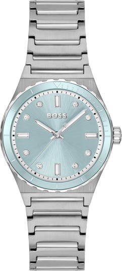 A light blue sunray dial brightens this minimalist bracelet watch marked with sparkling crystal indices for a dose of glam.