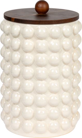 - With raised dots, an acacia wood lid, and a clean white color, this stoneware canister seamlessly blends into various kitchen styles, from modern farmhouse to contemporary, and can be displayed on countertops, shelves, or islands