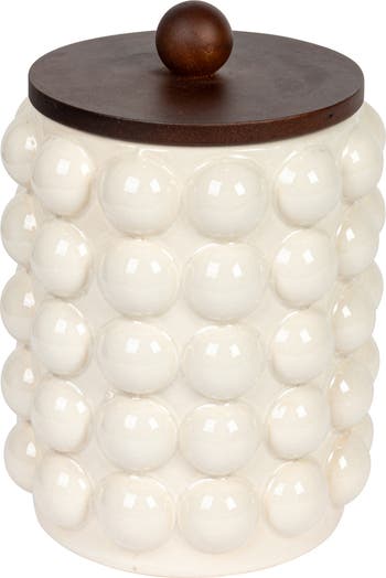 - With raised dots, an acacia wood lid, and a clean white color, this stoneware canister seamlessly blends into various kitchen styles, from modern farmhouse to contemporary, and can be displayed on countertops, shelves, or islands