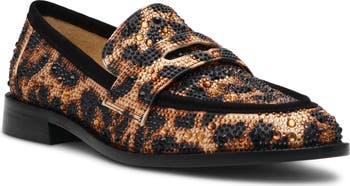 An essential penny loafer takes a glamorous turn thanks to a vibrant floral pattern and shimmering crystals that illuminate the classic silhouette.
