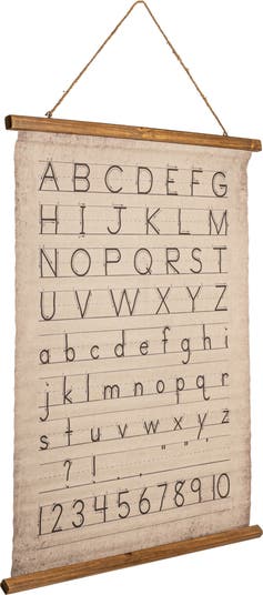 - A fun and educational wall decor piece that features a canvas scroll with colorful alphabet and numbers and a jute hanger