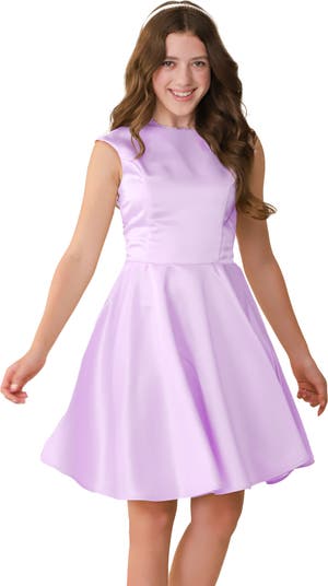 A splash of satin brings glamorous shine and light texture to a party-ready fit-and-flare dress that will keep your child shimmering under the lights.