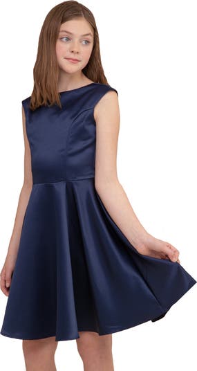 A splash of satin brings glamorous shine and light texture to a party-ready fit-and-flare dress that will keep your child shimmering under the lights.