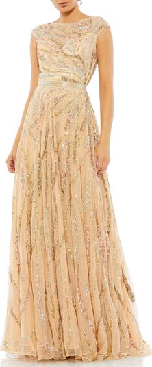 This elegant tulle gown features hand-applied sequins, a sequin-trimmed bateau neckline, cap sleeves, and an illusion bodice with sweetheart styling.