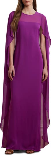 Deliver drama in a flowing georgette gown designed with caped sleeves that add extra elegance to the striking silhouette.