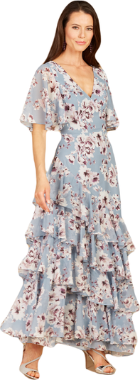 Our favorite new print dress! Truly a classic and timeless style that s perfect for any event. The ruffled skirt adds a bit of flair to an otherwise classy and classic dress. Features a v-neckline, cape sleeves for some coverage and a closed back for modesty.