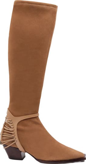 The Cara bootie is crafted from exquisite stretch suede leather, featuring a timeless Cuban heel adorned with a harness detail. Despite the apparent heel height, the combination of the welt and thick memory foam creates a remarkably comfortable experience, giving the illusion of height while providing a flat feel inside. Engineered with a spacious toe box and an elongated square toe, it prioritizes ease of movement, complemented by a memory foam insole and an inner zipper for added convenience. A leather welt not only safeguards the leather during extensive walking but also contributes to elongating the foot. The stretch suede technology ensures a snug, knee-high fit. This boot is meticulously designed with a three-part memory foam system that seamlessly blends comfort and style. Inside zipper and leather laces wrap around your ankle creating a beautifully tapered silhouette from your ankle to your knee. Designed with a sturdy, chunky heel and three-part memory foam system.
