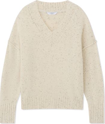 Flecks give a tweedy look to this slouchy V-neck sweater knit from a cozy-soft lambswool blend.