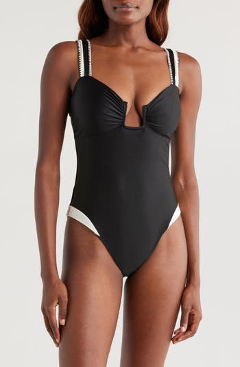 Covered hardware creates a drape at the neckline of this cheeky one-piece designed with elegant luster.