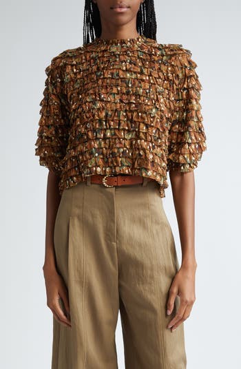 Metallic-flecked fil coupé and autumnal hues animate a silken top textured in rows of ruffles.