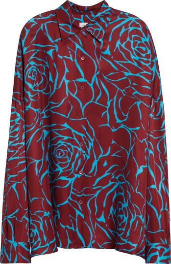 An allover woodblock print of roses writ large speaks to Van Noten s affinity for all things floral on an oversized button-up shirt elegantly framed with dropped-shoulder blouson sleeves.