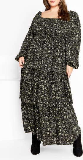 A flowery print romances this charming square-neck maxi made with a smocked bodice and a flouncy tiered skirt to sweeten the silhouette.