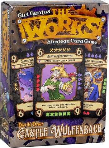 In Girl Genius: The Works, each card is a cog in a giant machine made up of a twelve-card tableau. On their turn, players flip, spin, and “pop” cards, which interact in different ways. Depending on the situation, cards can pop individually or in chains, giving you extra points, more cards, or something else entirely! The first player to 70 points wins! Four different 60-card decks, each representing a major arc of the Girl Genius story, are currently available. (You need only one deck to play.) Each card features unique, never-before-seen illustrations by Studio Foglio, the creative machine behind the steampunk webcomic Girl Genius.
