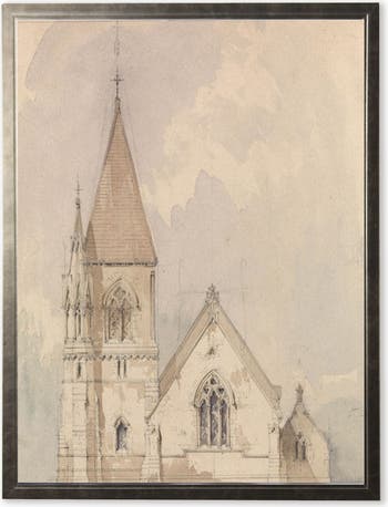 This painting reproduction print, framed in a silver wooden frame, features a painted cathedral. Sized at 18 inches by 24 inches, this made in the USA frame makes for a beautiful addition to any wall.