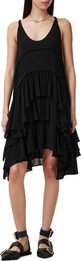Frothy tiers and an asymmetric hem that sways with every step define this lightweight dress designed in a racerback silhouette that only adds to the warm-weather style.