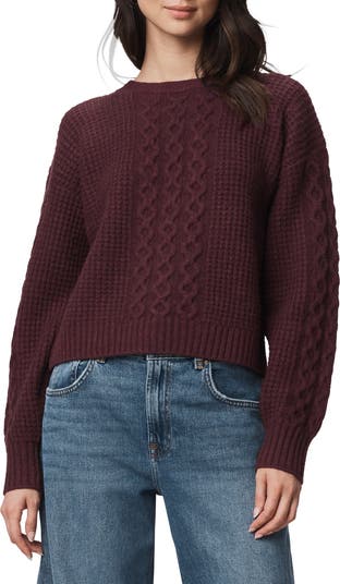 Dropped shoulders enhance the relaxed fit of this soft cashmere-kissed sweater knit with cozy cable stitching and anchored by ribbed trim.
