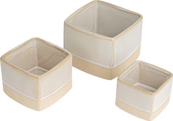 - A trio of cream-colored stoneware containers, each with a square form and a reactive glaze that whispers tales of artisanal mastery