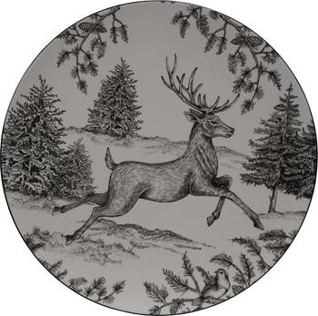 - A Diameter ceramic platter featuring a serene woodland deer scene with a colored edge in warm brown and cream tones