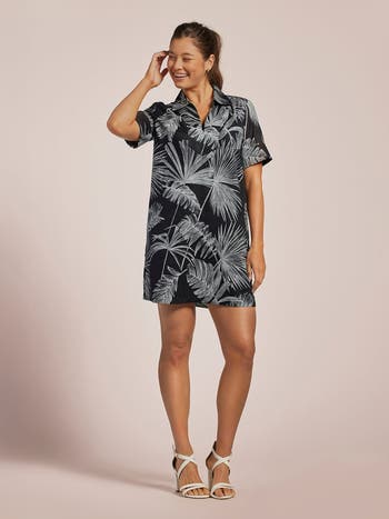 When moonlight pools over tropical foliage, fanned-out fronds light up like an X-ray image against the night sky.The perfect look to lounge in, AM to PM. The Monica is a short-sleeved shirt dress with an open collar. Made in a soft cotton voile with a slight slubbed texture.