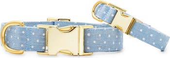 A sweet polka dot pattern with glinting hardware defines a cotton chambray collar that adjusts to perfectly fit your pup.