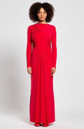 The Chara Dress is a graceful maxi design featuring long sleeves and a unique round ruched circle detail at the front. Its elegant silhouette and refined touches make it a perfect choice for special occasions or adding sophistication to your everyday wardrobe.