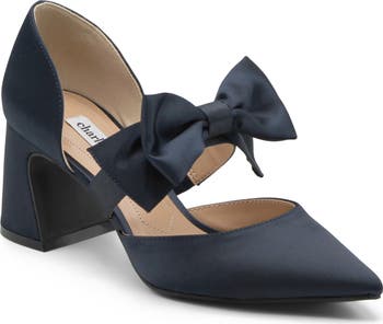 You ll be ready for your next occasion with this smooth satin pump finished with a block heel and bow-embellished strap.