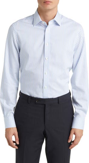 Wrinkle-resistant cotton twill keeps you looking smart in a dress shirt woven with crisp stripes that elevate a casual outfit and relax any formal look.