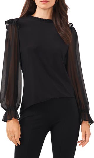 Dainty ruffles trim a mixed-media top fashioned with a soft knit body and sheer chiffon sleeves finished by frilly cuffs.