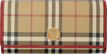 A continental wallet made from a coated cotton blend printed with the Burberry Check. The design is trimmed with calf leather in seasonal ruby red and detailed with a logo-engraved press stud.||Foldover flap with press-stud closure|12 card slots|Interior zip compartment, two interior expandable compartments, interior slip pocket, exterior slip pocket|Hand-painted edges|Polished metal hardware|Comes with a dust bag