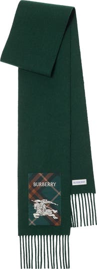 A cashmere scarf, made at a Scottish mill founded in 1797. Woven on traditional looms, the fabric is washed in local spring water and receives two further washes for an ultra-soft finish and fuller texture. Reworking the label from our signature trench coats, the style features an appliquéd patch woven with the Burberry Check, logo and Equestrian Knight Design.||Rectangular|Fringing at both ends|Appliquéd Burberry Check label