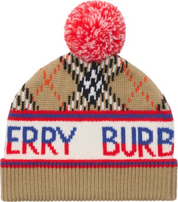 A beanie in a soft wool blend, topped with a playful speckled pompom. The design is knitted with our logo, stripes and the Burberry Check in signature sand beige.||Rib-knit trims|Knitted Burberry lettering