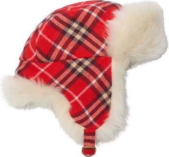 A trapper hat made in Italy from wool flannel, woven with the Burberry Check in seasonal crayon red as part of our Year of the Horse capsule. The padded style is lined with soft shearling at the front and side panels. Adjust the fit with the shield-shaped buckle at the chin strap.||Adjustable buckled strap|Engraved Burberry lettering at buckle