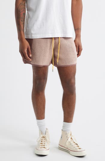 Tackle hot weather in the cool style of these comfy elastic-waist shorts in a patchwork of breezy openwork-knit squares.