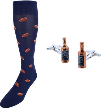 For a limited time, grab this value combination of our Cheers Whiskey Bottle Novelty Cufflinks and our Touchdown Football Mid-Calf socks for a gift for that hard to buy for gentleman on your list. This combination will match many outfits, and help elevate it to the next level, while showing off your personality and staying professional looking. Crafted with premium materials, the socks are proudly made here in the United States. Cufflink s measure 5/8 x 1 inch. Socks fit shoe sizes 7-12.5.