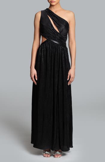 Catch the light from every gorgeous angle in this pleated metallic gown with sultry cutouts and a high slit befitting your main-character moment.