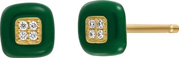 Verdant enamel frames four diamonds on each of these geometric stud earrings handcrafted from 18-karat gold.