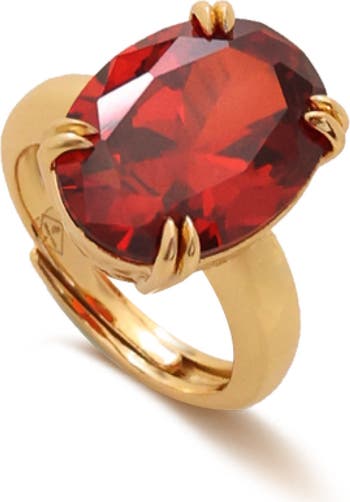 - Rich cherry-red CZ with multi-facet oval cut, brightening the hand.