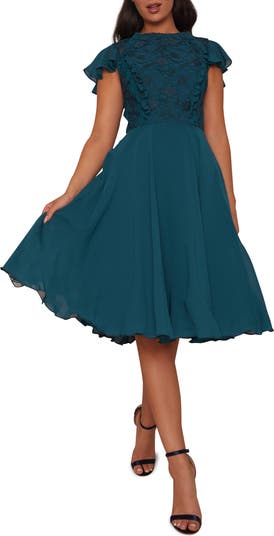 Delicate floral lace and feminine ruffles define the bodice of a fit-and-flare midi dress finished with flutter sleeves and a flowy skirt.