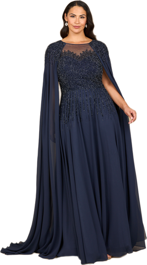A chiffon A-line long gown adorned with beaded bodice and long flowing cape sleeves. The high neckline adds a sophisticated touch, making it perfect for the mother of the bride or groom.