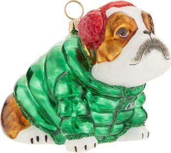 Outfitted for the season in a glitter-dusted coat and earmuffs, this handpainted blown-glass ornament is the perfect way to pupdate your holiday decorations.