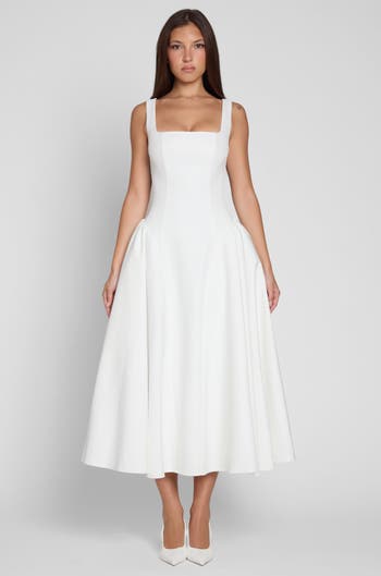 This midi dress features internal corset boning that sculpts and supports while the square neckline frames the décolletage and gathered hip detailing creates soft volume through the midi-length skirt.