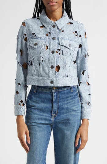 Embroidered eyelets punctuate a floral-embroidered jacket crafted from nonstretch cotton denim for a crisp fit with every wear.