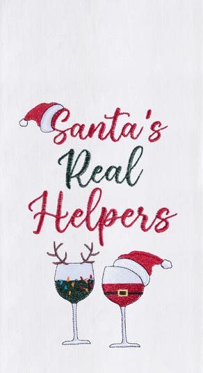 Christmas Theme "Santa s Real Helpers" Red White Wine Glasses Cotton Flour Sack Kitchen Dish Towel Decor Decoration 27L x 18W in.