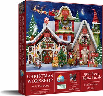 Embrace the festive spirit with the Christmas Workshop 500 Piece Jigsaw Puzzle by SunsOut Puzzles. Use this adult puzzle, featuring the intricate artwork of Tom Wood, to immerse yourself in the cozy charm of Santa s Workshop while marveling at the high-quality recycled cardboard pieces printed with eco-friendly soy-based inks. The interlocking pieces fit seamlessly for an enjoyable puzzle assembly experience, while the completed size of 18" x 24" makes it a perfect holiday home decoration. SunsOut s commitment to producing each puzzle in the USA includes using eco-friendly materials and a worry-free guarantee, emphasizing both sustainability and artistic excellence. As a woman-owned small business, SunsOut ensures every puzzle is a sustainable treat. The licensed artwork by renowned artist Tom Wood vividly brings Santa s magical workshop to life with his attention to detail and vibrant color patterns. This enchanting puzzle, offering more than an afternoon activity, serves as an ideal gift for puzzle enthusiasts and Christmas lovers alike. Packaged in a large, full-color display box, this puzzle transforms from a pastime to a holiday spirit celebration as you complete the captivating image of Santa s Workshop.