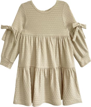Dress your little one in enchanting elegance with the Cinnamon Sugar Dress. Its delicate textured fabric, woven with subtle patterns, pairs effortlessly with its soft beige hue to create a beautifully refined look. Featuring charming bows at the sleeves and a flowy tiered silhouette, this dress offers a harmonious blend of comfort and style that?s ideal for making everyday moments feel special. Fabric Content Care 59% POLYESTER 33% VISCOSE 8% SPANDEX Machine Wash Cold | Line Dry | Do Not Bleach