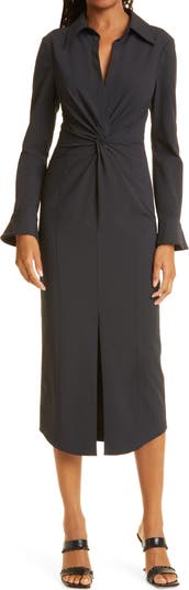 Twisted detailing defines the waist of a flattering dress fashioned with a point collar and flared cuffs.